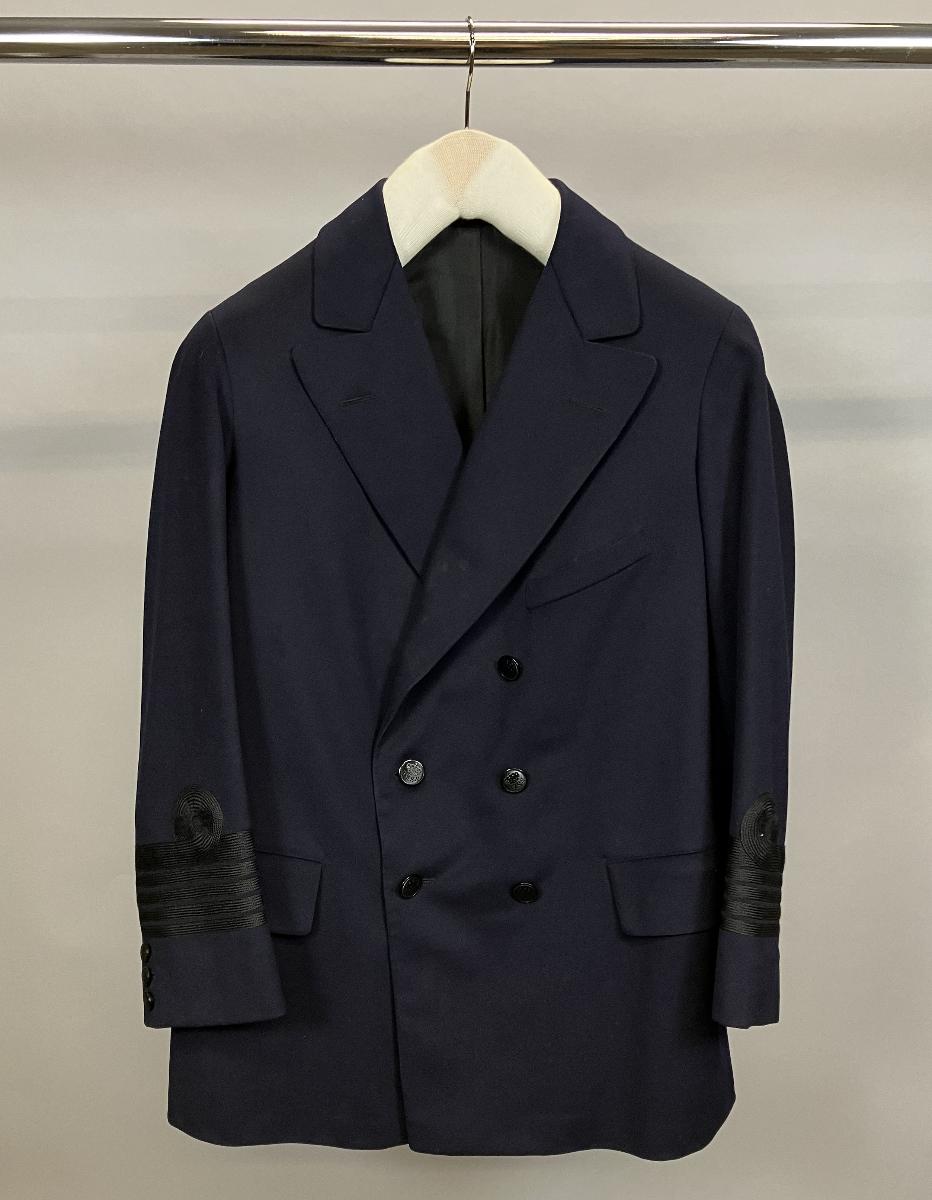 Mörkblå med dubbla rader svarta plastknappar med bokstävena 'G.K.S.S.' och krona i relief. 2 vanliga fickor och en bröstficka. Svata galoner vid ärmana.