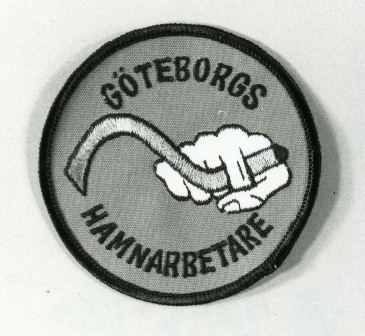 Tygemblem att fästa på kläder med texten ”Göteborgs Hamnarbetare” och en hand som håller i en grips.