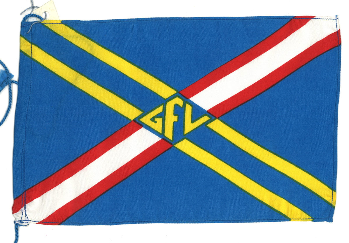 Rederiflagga för GFL av blått tyg med sydd kant runt om. Rederimärket består av ett heltäckande kryss med den ena stapeln i danska och den andra med svenska färger. I centrum rederiets initialer 'GFL'.