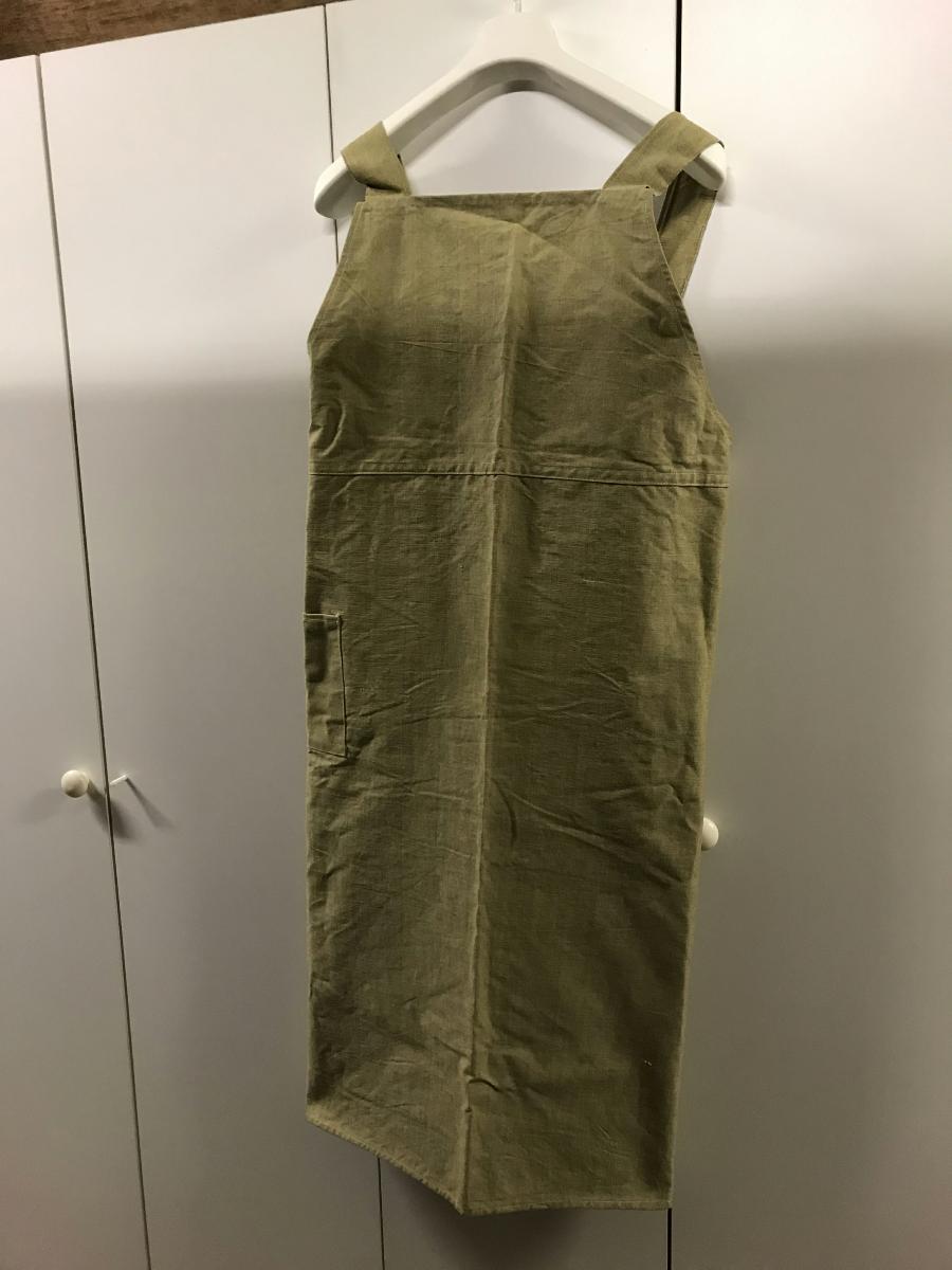 Förkläde, handsytt av grå-brun bomullsväv, med nackband samt påsydd ficka och två vitmetallsknoppar. Märke: På baksidan skrivet med blåskrift: 15. Kond: Nytt. Prov: Har ägts och troligen även sytts av givarens fader Johan August Lindén som dött i början av 1900-talet.