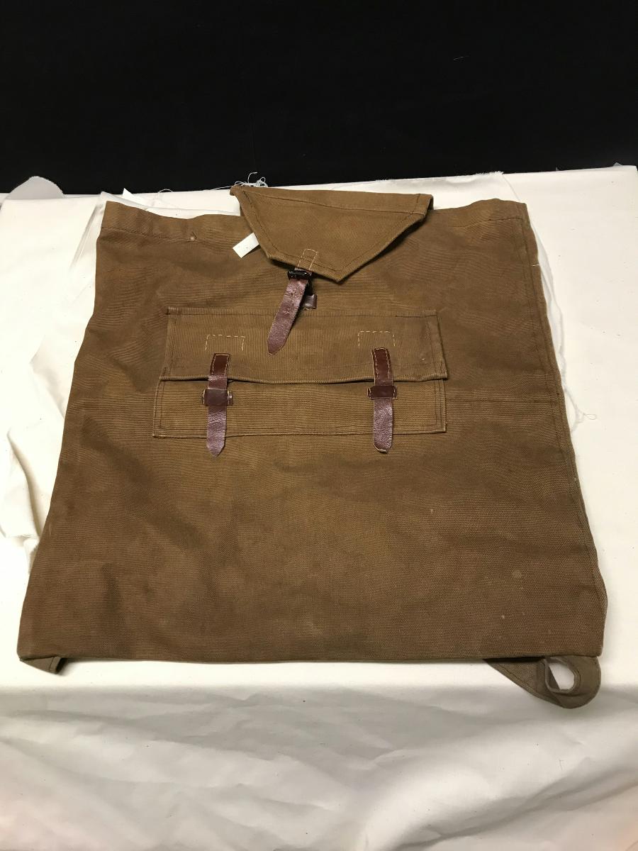 Ryggsäck av handsydd brun bomullsduk, med en yttre påsydd ficka på utsidan och med en enklare ficka på insidan, på baksidan med två axelrämmar. Kond: God. Prov: Har ägts och troligen öven sytts av givarens fader Johan August Lindén som dött i början av 1900-talet.