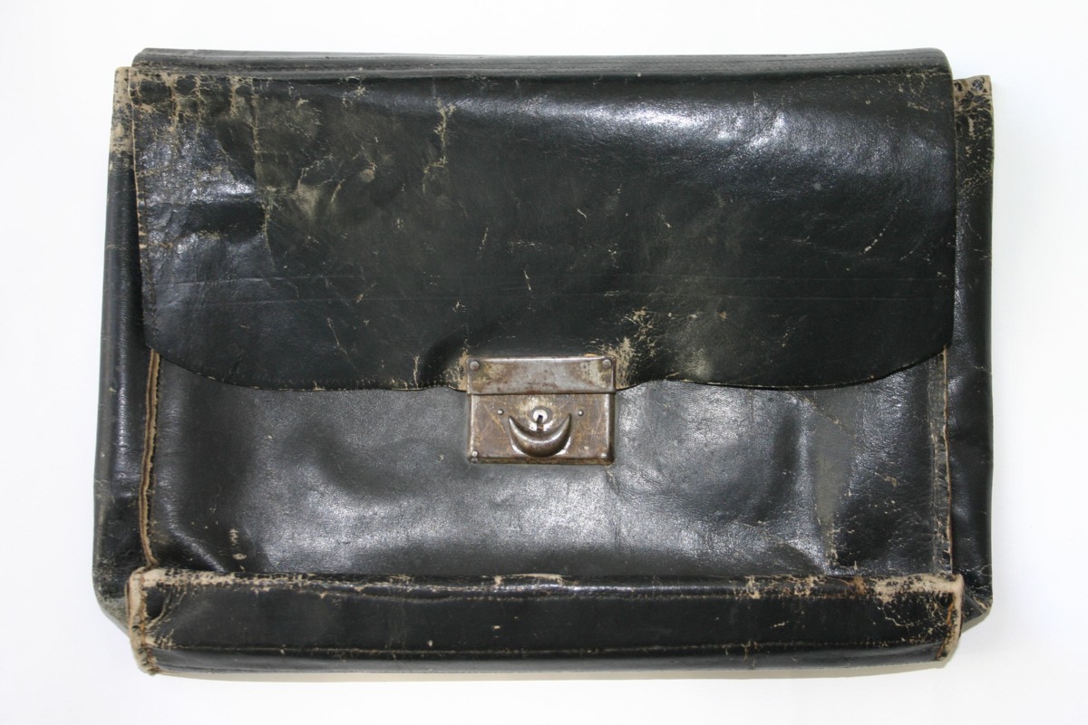 Tatueringsväska eller portfölj av svart läder med metallspännen. Innehållande en textlificka i ljusrött bomullstyg samt 56 stycken färglagda och oftast lackade tatueringsförlagor. Förlagorna är delvis uppklistrade på väv bredvid varandra så att de bildar ett 'dragspel'. I väskan finns också ett skissblock med mer eller mindre fullbordade tatueringsförlagor. Dessutom finns i väskan en plånbok av rödfärgad läderimiterad textil, innehållande 180 mönsterblad (så kallade, Mönsterkopior). Dessutom finns löst i väskan 24 st extra mönsterblad.