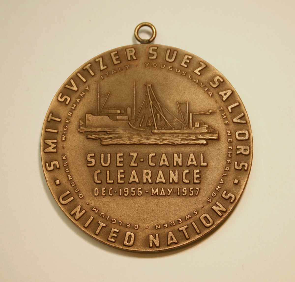 Medalj med upphängningsögla, utdelad av FN för deltagande vid arbete med att rensa Suezkanalen från december 1956 till maj 1957.