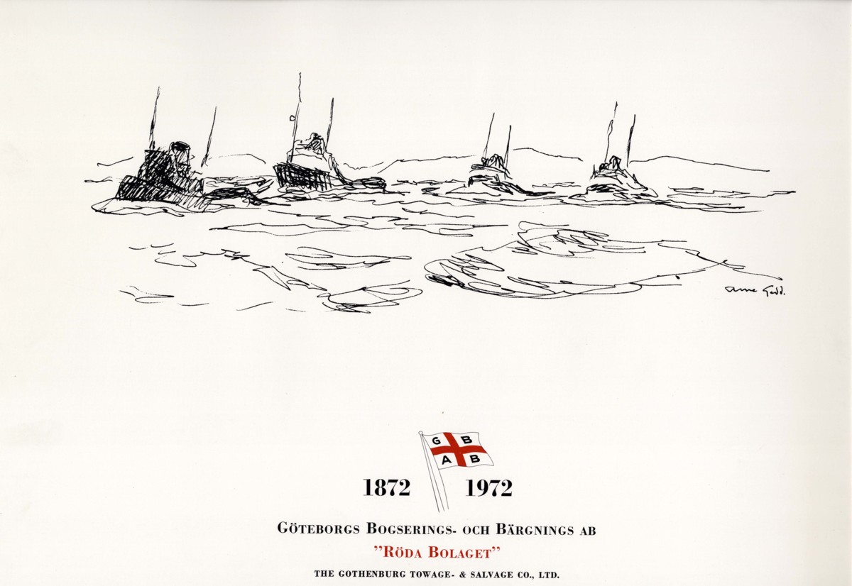 Text från häftet: "För att ge en minnesbild av - "Röda Bolagets" - utveckling under de hundra år som gått sedan bolaget grundades år 1872 har vi låtit ett antal konstnärer ge sitt uttryck åt sin syn på några historiska intressanta fartyg och händelser. Vi hoppas att dessa orginaltryck, framställda för detta jubileum, skall påminna om - "Röda Bolaget" - och dess verksamhet."