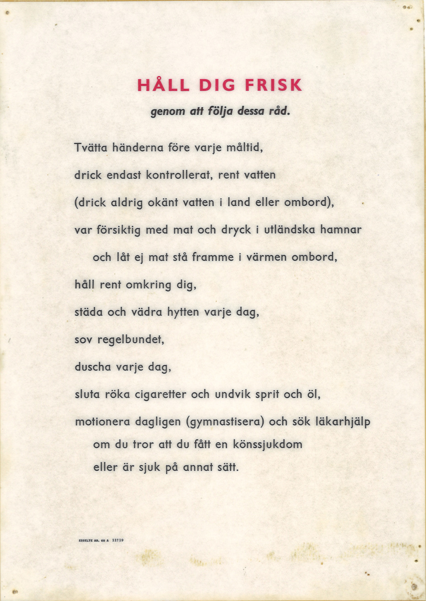 Tryckt anslag med titeln "Håll dig frisk". Innehåller hälsoföreskrifter och uppmaningar för sjömän. Anslaget monterat bakom ett skyddslager av transparant plast. Anslaget har varit uppsatt på något av Johnson Lines elevfartyg.