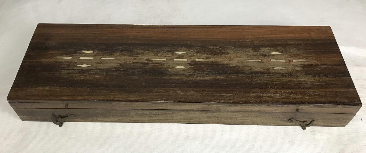 Trä med beninläggningar i locket. De bildar tre grupper med fem figurer: två kilar, två dubbeltrianglar och en rektangel. Skrinet är rektangulärt av rödaktigt trä. Insidan och botten är klarröda. Lock med hänglås och två haspar.