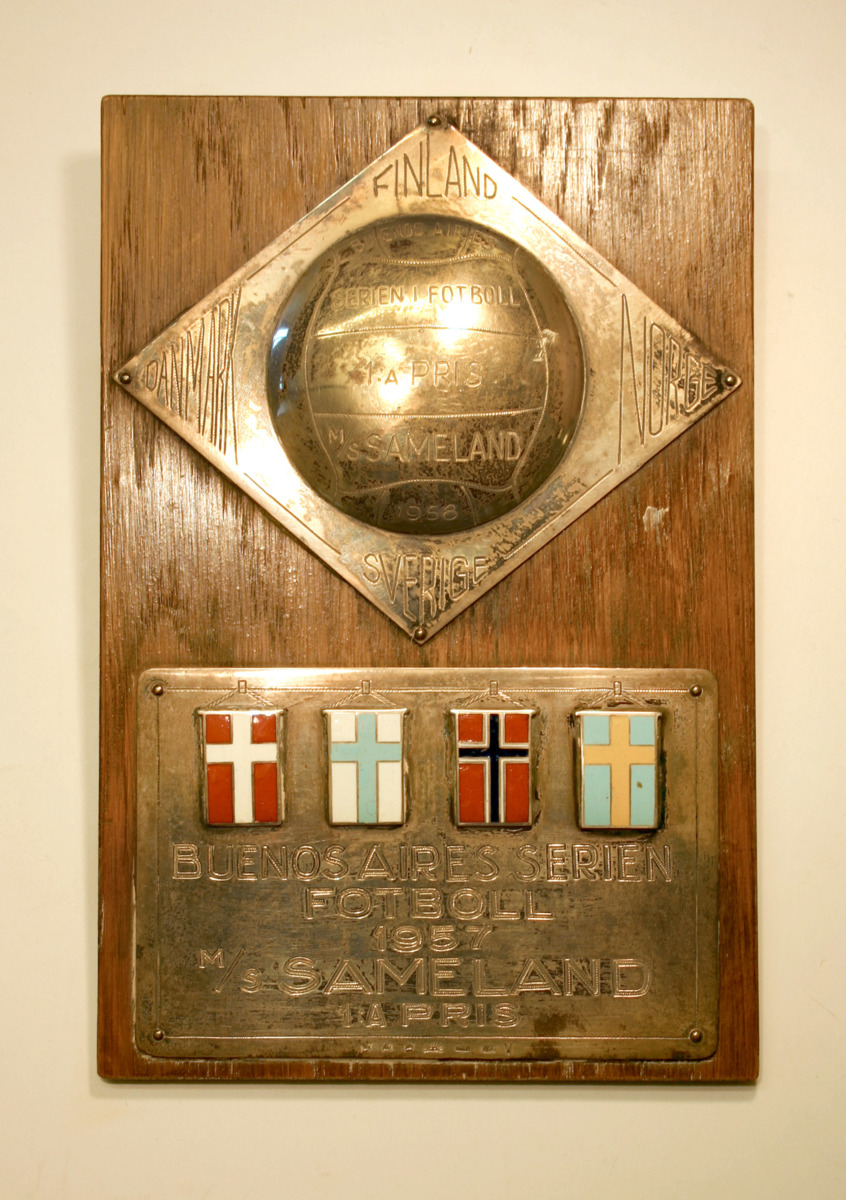 Gravyr: Bueno Aires serien i fotboll 1:a pris m/s Sameland 1958. Finland, Danmark, Norge, Sverige.