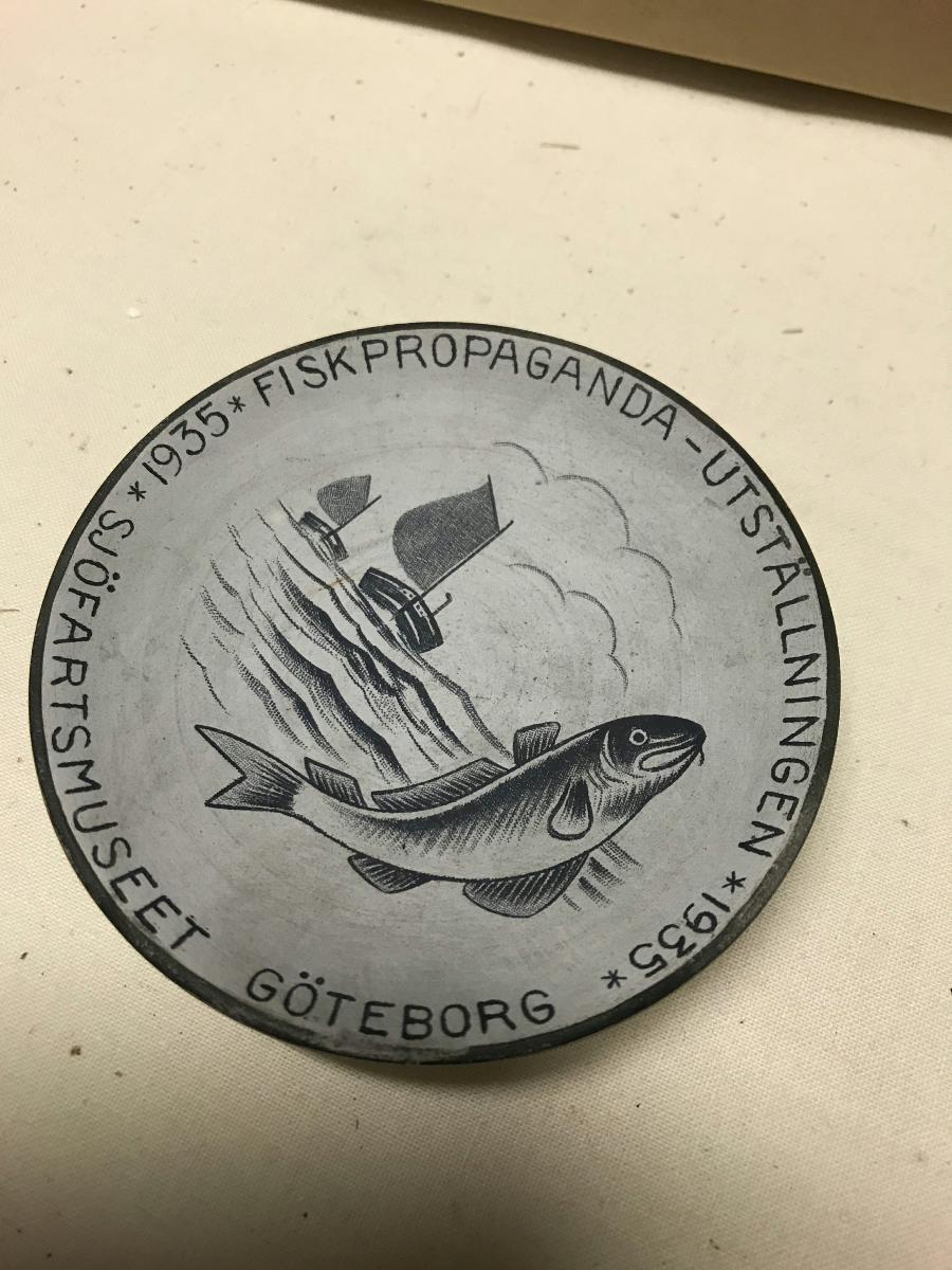 Glaserad skål. Motiv: två fiskebåtar och en fisk. I ytterkanten text i versaler: '1935 * Fiskpropaganda-Utställningen * 1935 * Sjöfartsmuseet Göteborg'. Identisk med SMG 42485 utom i glasyr och färg - prov.