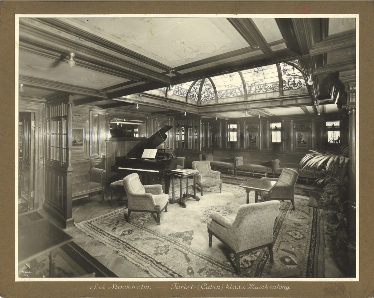 Uppklistrat svartvitt fotografi Turist (Cabin) klass, musiksalong.