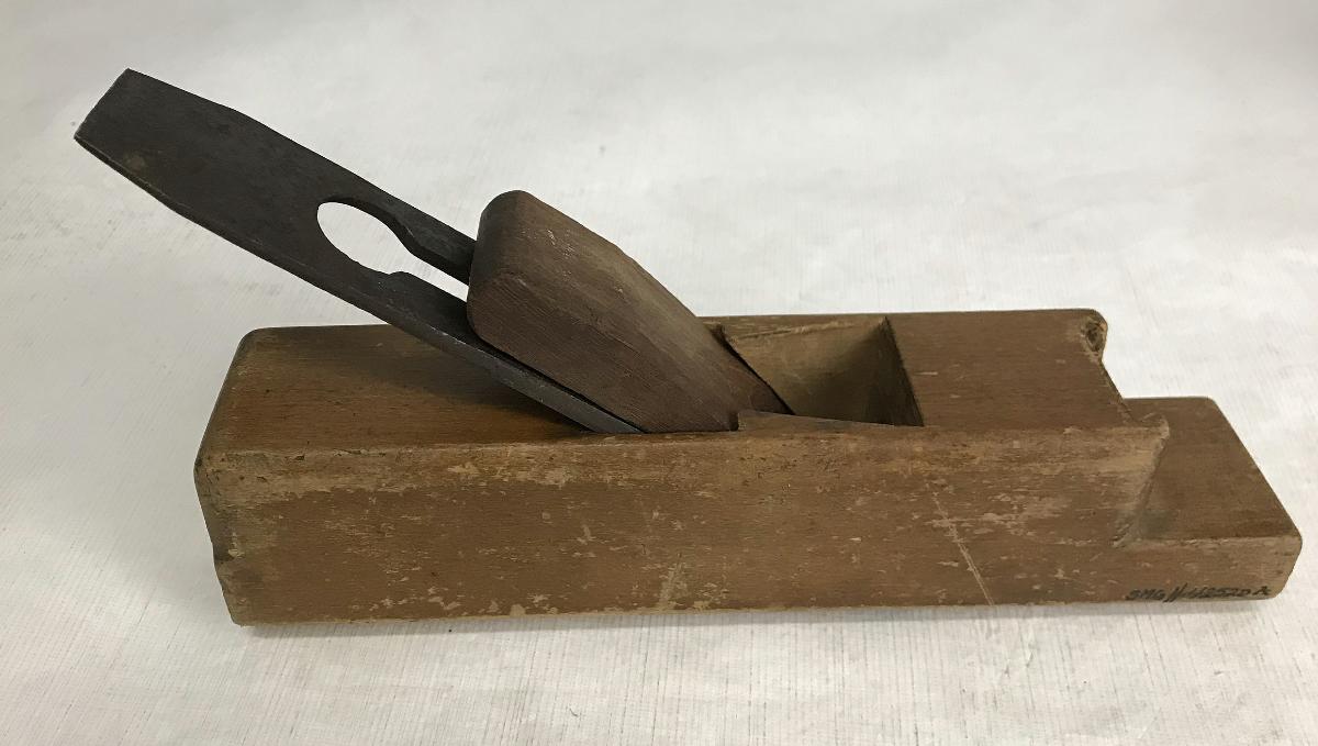 Krum undersida, stocken har raka sidor och plann ovansida. Hornet framtill saknas. Hyveln förnissad.