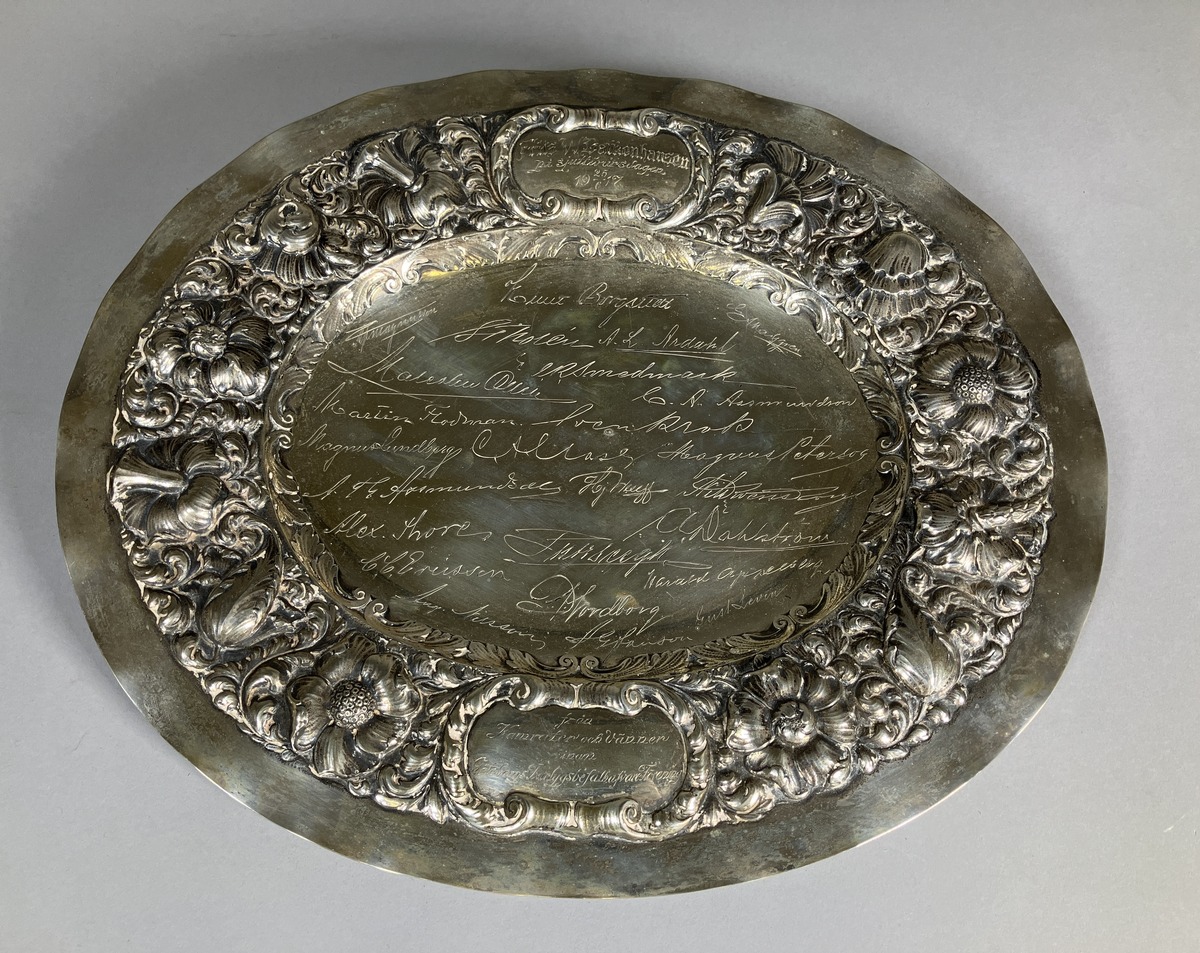 Minnesfat med veckad kant, på brämen blom- och snäckdekor i relief. På botten graverade namnteckningar.