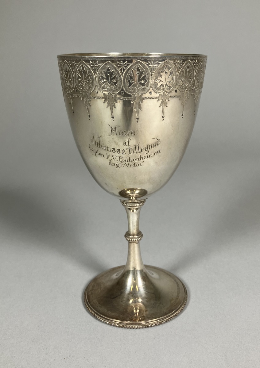 Minnespokal på fot med förgylld insida. Profilerat skaft och pokal med graverad bladdekor.