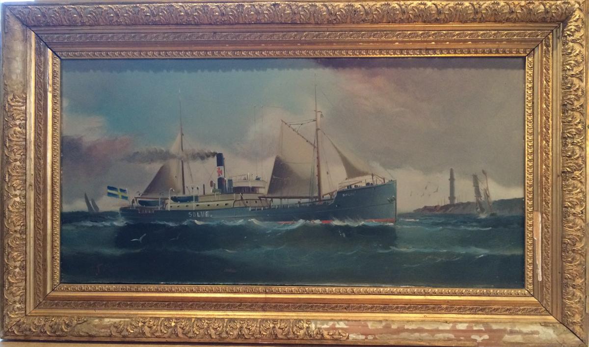 Fartygsporträtt föreställande det tvåmastade ångfartyget SÖLVE. Visar henne gråmålad, med segel och namnet på sidan. Förom syns en fyr samt några segelfartyg. Målad på kartongpannå.