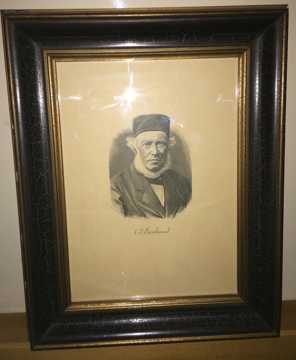 Trägravyr; Porträtt, bröstbild, snett framifrån. Från vänster sida visande Otto Edvard Carlsund 1809-1884, bl a chef för Motala Verkstad 1843-1870. Carlsund är klädd i jacka, fluga och fezliknande mössa. Kondition: Ramen något kantstött. Påskrift N 'O.E. Carlsund'