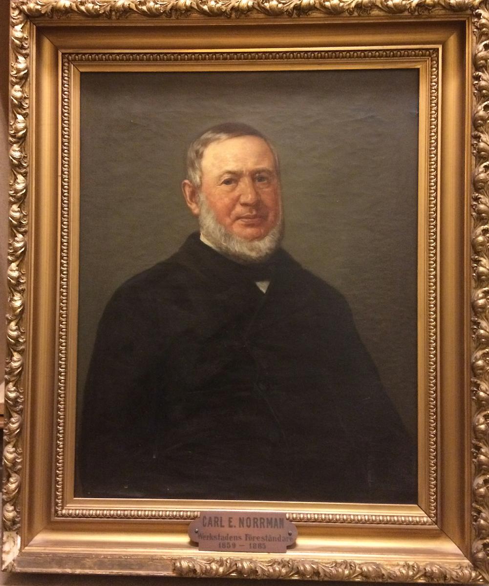 Oljemålning; Porträtt som bröstbild visande Carl Elis Norrman, chef för Lindholmens verkstad 1859-1885. Personen klädd i mörka kläder, barhuvad och försedd med vitt helskägg. Kondition: Ramen skadad i nederkant, delar saknas. Påskrift: N på ram. Carl E. Norrman, Verkstadens föreståndare 1859-1885.