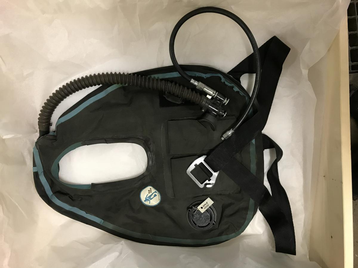 Kompensationsväst: Svart med blå nylonskarvar. På västens högra sida sitter en rund dekal med texten: ScuB Auqa, Göteborg, (säljaren).