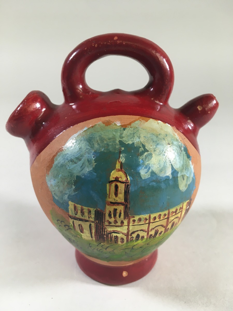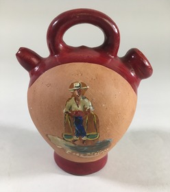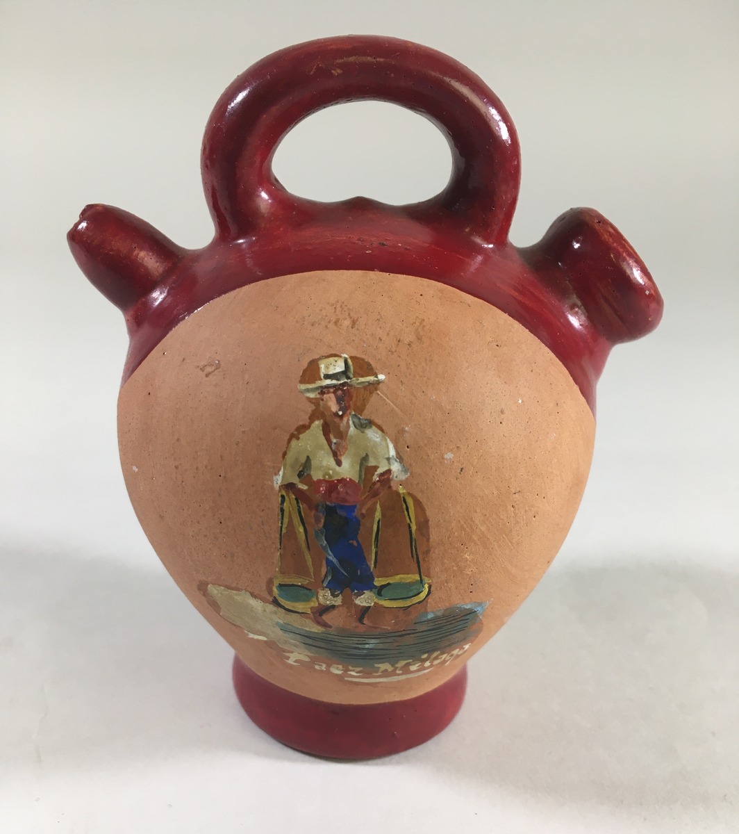 Miniatyr av vatten/vinkrus i oglaserad lera med dekormålning vattenbärande man och vy med kyrka. Rödlackerad fotring och rödlackerad överdel med handtag. Under vyn med den vattenbärande mannen står textat: Paez Malaga.