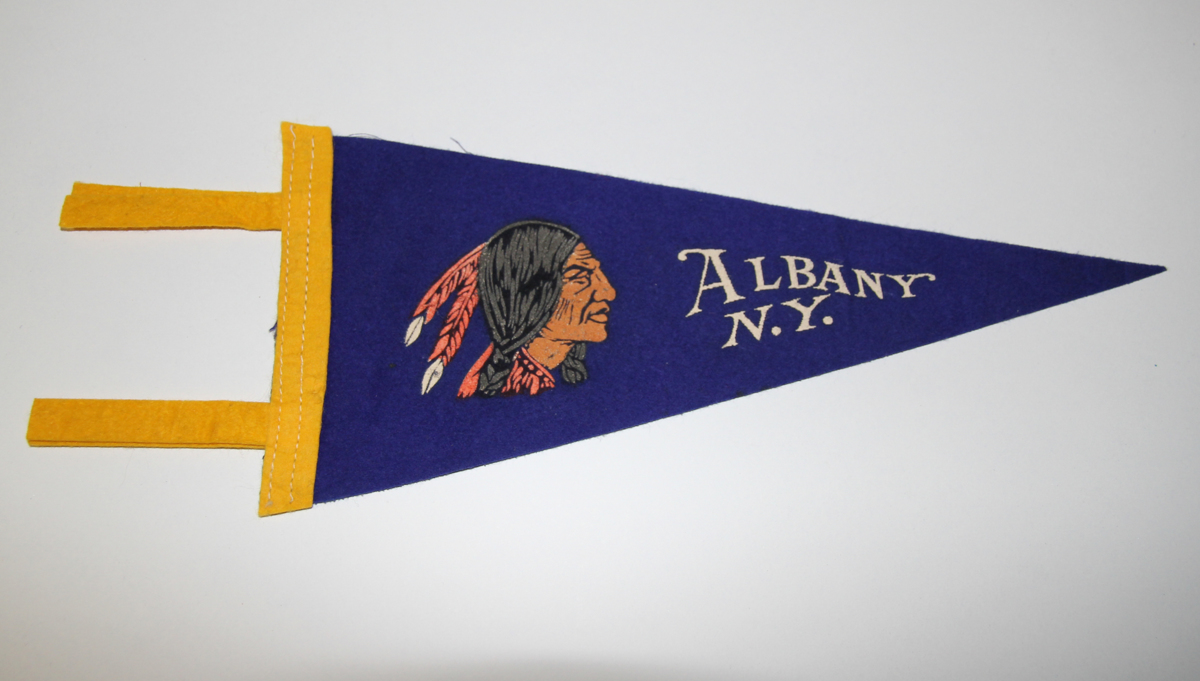 Blå filtvimpel med vit text och gul bakkappa med gula band. Till vänster om texten: Albany N.Y. finns ett indianhuvud.