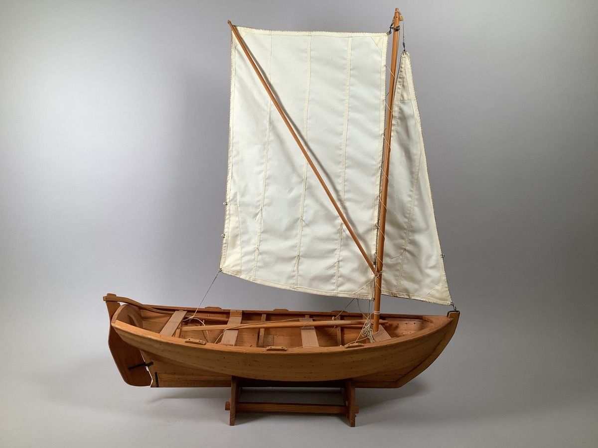 Fullmodell av s k 'Falkejulle' (bohusjulle) från Orust ca 1920. Klinkbyggd julle av bohustyp med kraftigt fallande stäv och akterspegel, två fasta och två lösa tofter, 2 lösa åror, sprisegel/storsegel, fock (klyvare). Benämningen 'Falkejulle' härör från en donation genom ett testamente från 1853 där sillsalteriägaren/jordbrukaren Anders Falk donerade medel till 'båtar af fattiga, odugliga fiskare som annars merendels skulle tillgripa tiggarstaven'. Originalet är byggt på 1920-talet av Johan i Damm ovanför Kungsviken, Orust. Har bl a använts som badgästseglare på Gullholmen. Har tidigare varit riggad med mesan, nuvarande rigg är en rekonstruktion. Båten står nu på Bassholmen i dåligt skick. Ägare: Thomas Thieme, Göteborg. Litteratur: Hansson, Olof, 'Min bardom på Gullhomen', sid 205.