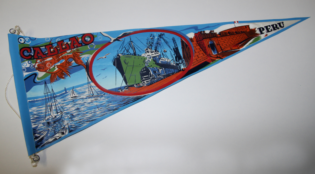 Av syntetmaterial med färgtryck, olika vyer från Callao. Centralt på vimpeln, lastfartyg vid kaj, i vänster bildfält kustvy och text: Peru. På bakkappan sitter en metalltråd med öglor infällda, i nedre öglan en silkessnodd.