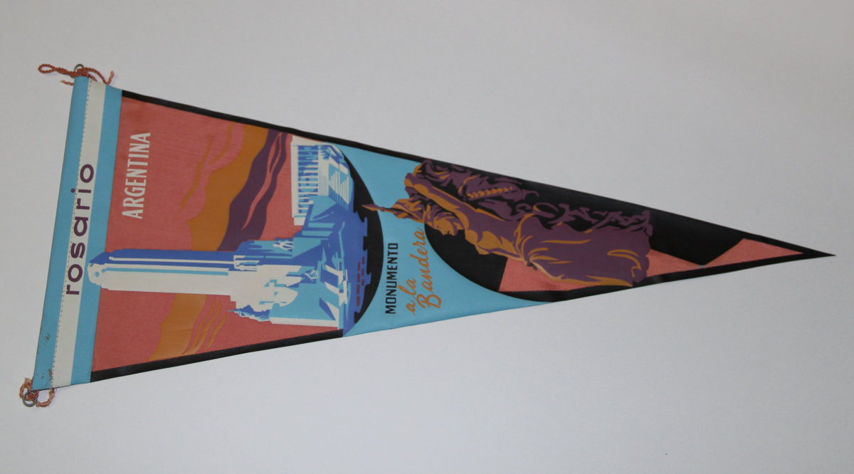 Av syntetmaterial med färgtryck visande vy ifån staden Rosario i Argentina. Text på bakkappan: rosario i lila (gemena) nedanför står ARGENTINA med vita versaler och under vy visande monument står MONUMENTO med svarta versaler och a la Bandera med gula gemena. På bakkappan rosa silkessnöre fastsatt i metalltråd med öglor.