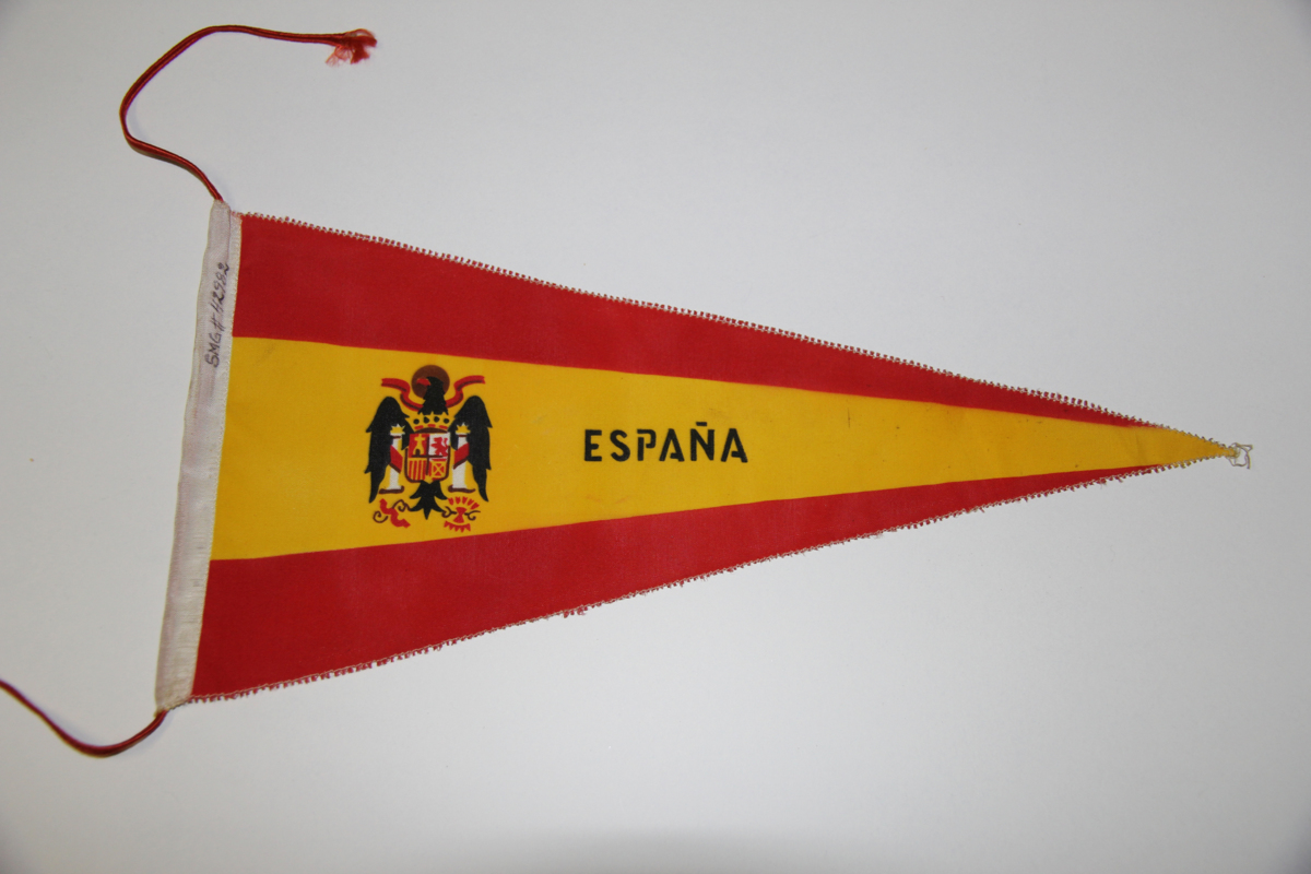 Av syntetmaterial i spanska nationalfärgerna rött/gult. Mitt på vimpeln står ESPANA (versaler) spanska 'riksvapnet'? Bakkappan vit med rött silkesnöre (47 cm).
