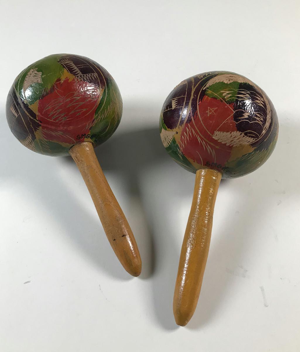 Tillverkade av urholkade kokosnötter med trähandtag. Målade i grönt, rött, lila och ornerade i folkoristisk stil med stiliserade sjö- och landmotiv. På den ena står det Cuba (SMG42986, a) och på den andra HAVANA (SMG42986, b).