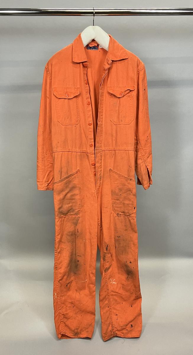 Överdragsställ: Orangefärgad bomull, storlek C 52. På insidan nedanför kragen sitter en fastsydd tygetikett i rött/blått med text: Kvalitet, slitstyrka - passform, C 52, Sanfor-krympt. På ryggens utsida, tryckt text i vitt med versaler: NORDSJÖFRAKT.