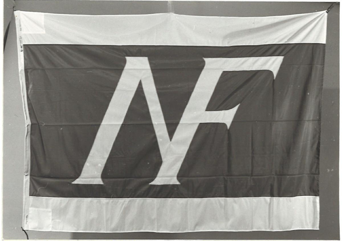 Rederiflagga för AB Nordsjöfrakt, tillverkad i poyester. Brett blått längsgående fält med infälld logotype NF i vitt, på båda sidor om det blå fältet vita smalare fält. Bakkappan är förstärkt med ofärgat bomullsband och har infälld fastgöringsanordning av blått syntet-rep med en mässingshake i övre ändan. Gåva i samband med dokumentation om Ro-Ro-fartyget m/s Anna Oden.