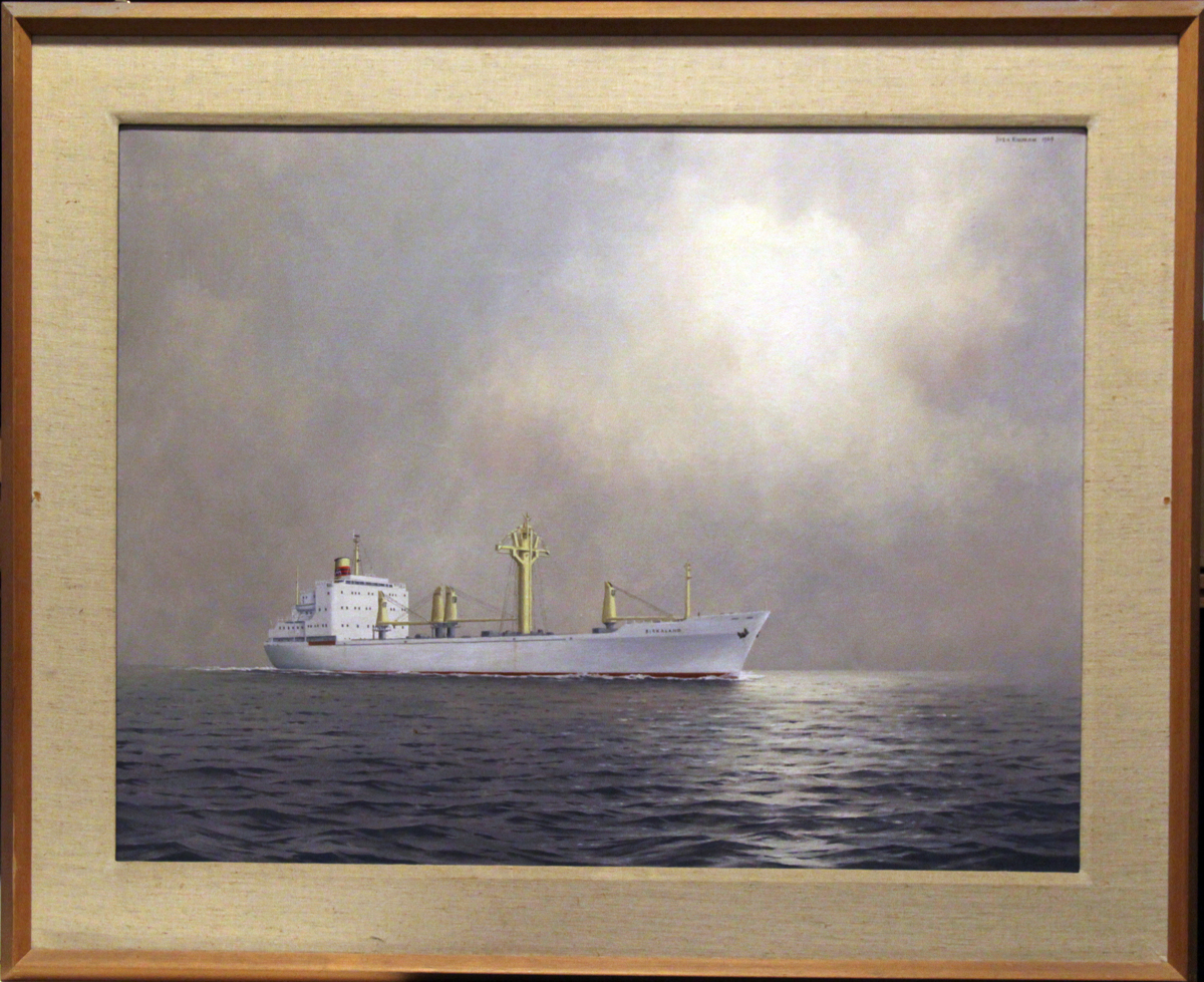 Fartyget ses från styrbords sida snett för ifrån under gång på öppet hav. Havet lugnt och himlen mörk, som av ett annalkande oväder, solen bryter igenom något. Fartygets namn 'Birkaland' på bogen. På baksidan av ramens övre högra kant står antecknat i tusch: Gudmorsgåva Birkaland. Med bläckpenna står Nr. 1153 antecknat på spännramens övre kant. Originalram från 1969 (?), ytterlist av omålat trä och inre list klädd med linneduk.