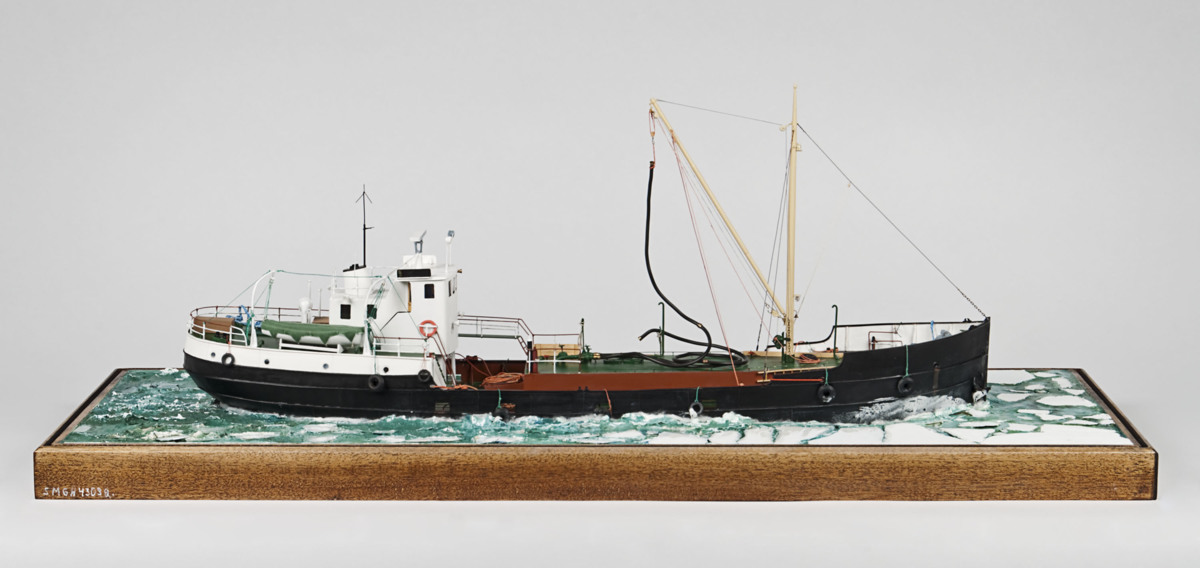 Museimodell. Vattenlinjemodell på träplatta i glasmonter. Modellen visar mindre tankfartyg med på aktern namnet VÄSTTANK, däck grönt, överbyggnad vit. Modellen är placerad på bottenplattan, på vilken 'vatten och isflak' byggts upp. Modellen visar fartyget VÄSTTANK under 1988, då hon brukades som bunkerfartyg i Göteborgs hamn.