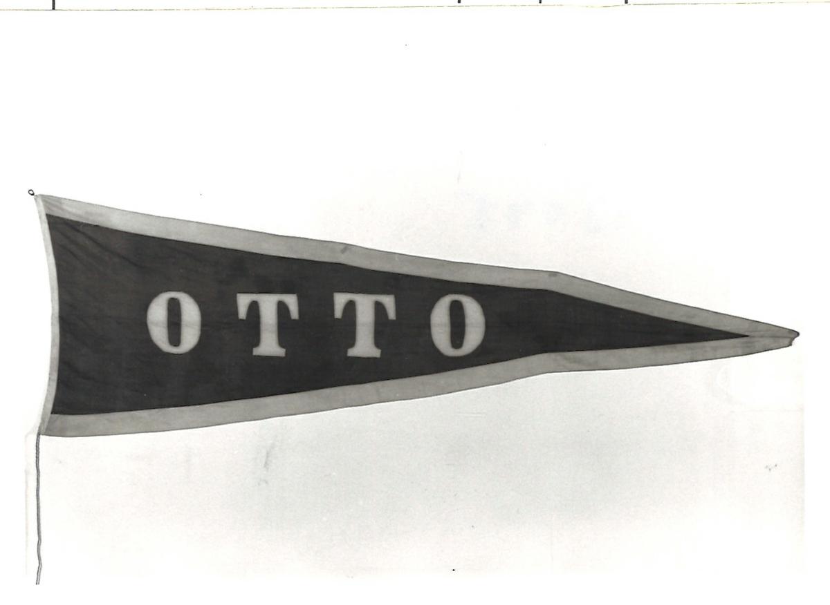 Sjösättningsvimpel till OTTO,1932, bogs. Namnvimpel: Blå med gula kanter. /OTTO/ infällt med vita bokstäver. Vit bakkappa med metallögla i överkant och snöre i nederkant.