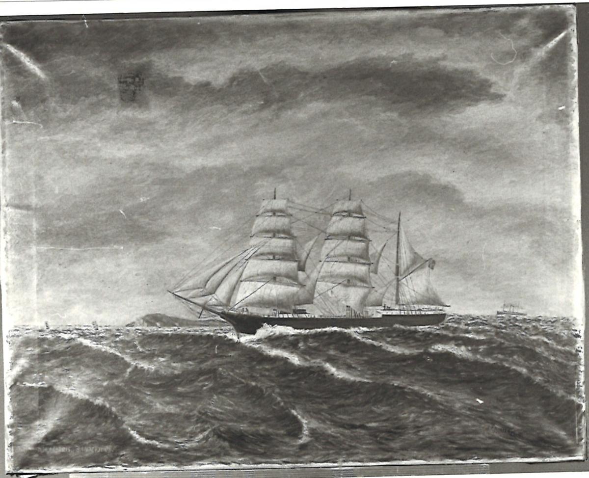 Skeppsporträtt visande svartmålat barkskepp seglande för fulla segel för SBs: halsar. I bakgrunden andra fartyg och land. Havet är grönt och himlen blå-vit. Gustaf Wilhelm Nilsson tjänstgjorde på fartyget i sin ungdom. Förlagan till oljemålningen tycks vara ett fotografi som tillförts museets fotosamling.