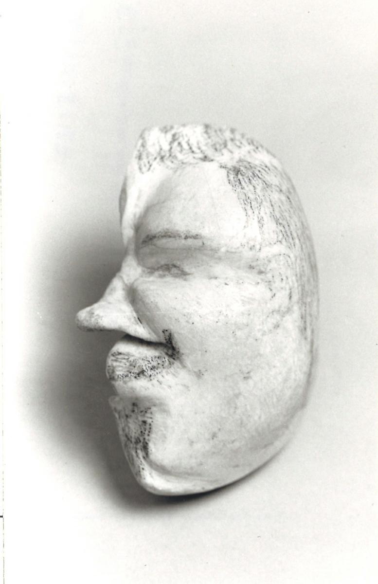Valöra: Dekorerad med krita på ena sidan, en man i profil med svart hår, mustasch och pipskägg, orange öra och blått öga.