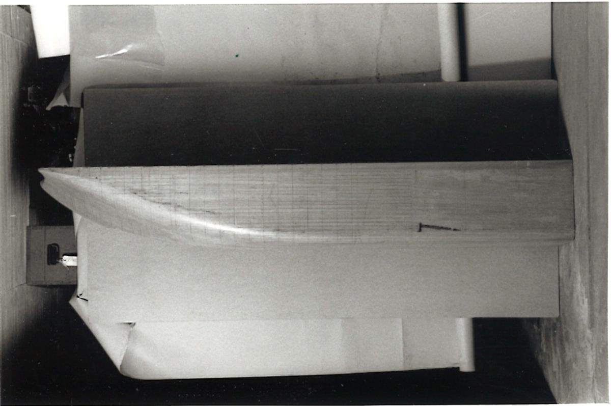 Inplanering och storleksbestäming av bordläggningsplåt samt utslag för olikformade bordläggningsplåtar. A= Förskepp: Kvartsmodell, med metallöglor, har spant- och plåtmarkeringar i svart tusch och blyerts. Uppbyggd back. B= Akterskepp: Kvartsmodell med metallöglor, har spant- och plåtmarkeringar i svart tusch och blyerts. Uppbyggt akterparti. A och b fogas ihop till en halvmodell. Från varvssamlingarna VHF.'562' på akterskeppet. Plåtmarkeringar