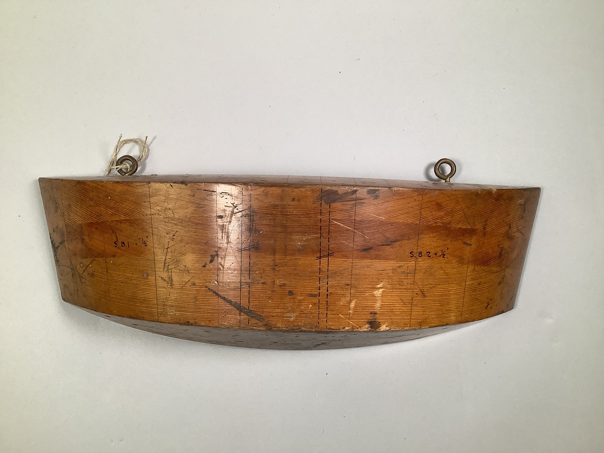 Inplanering och storleksbesämmning bordläggningsplåt samt utslag för olikformade bordläggningsplåtar. Halvmodell: Med metallfästen. Spant- och plåtmarkeringar i svart tusch och blyerts. Troligen till dockport.