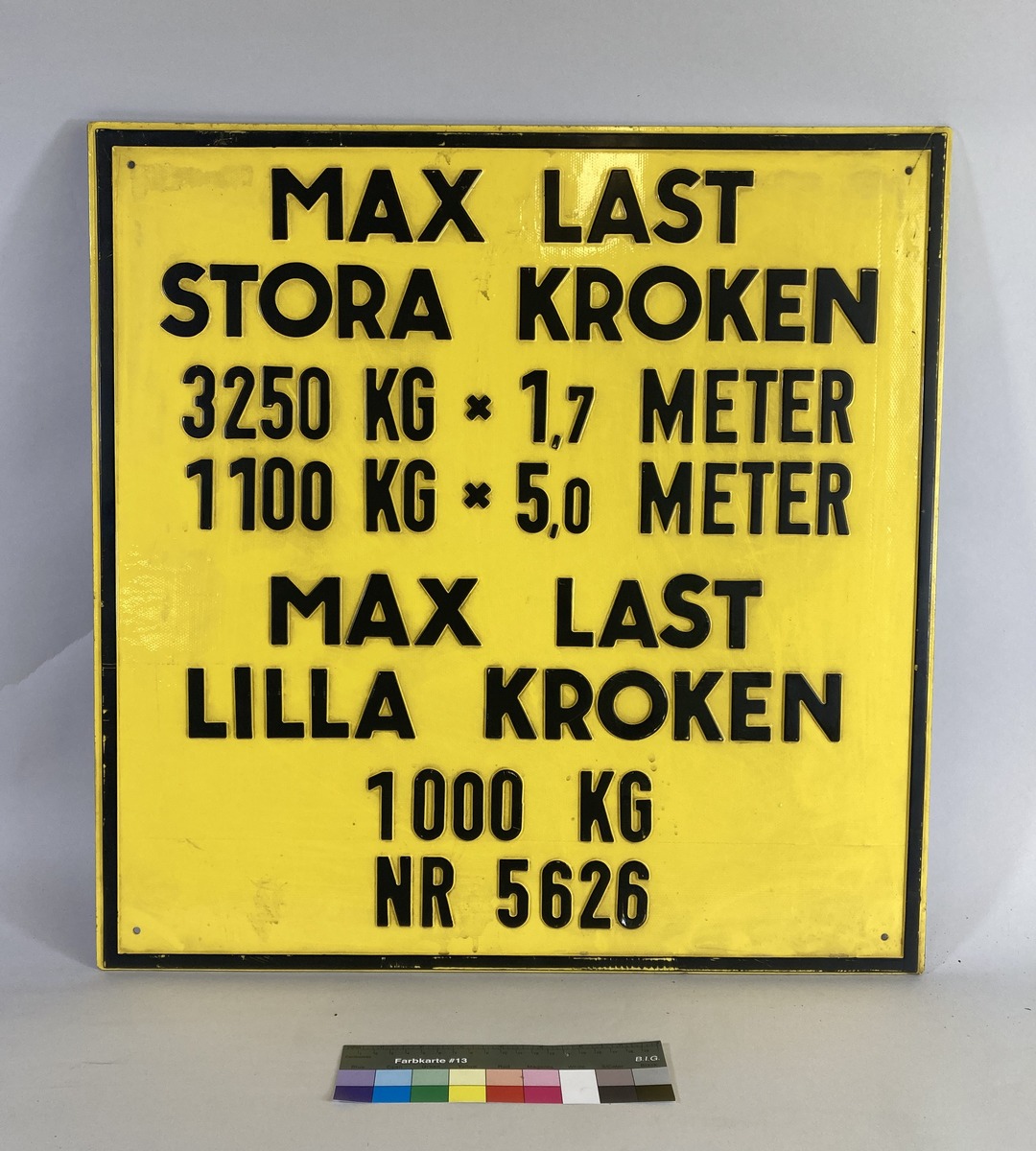Att sätas på lyftkranar. Visar max-last på stora och lilla kroken. Skylt: Svart text på gul botten, /MAX LAST STORA KROKEN 3250 KG x 1,7 METER, 100 KG x 5 METER. MAX LAST LILLA KROKEN 1000 KG NR 5626/