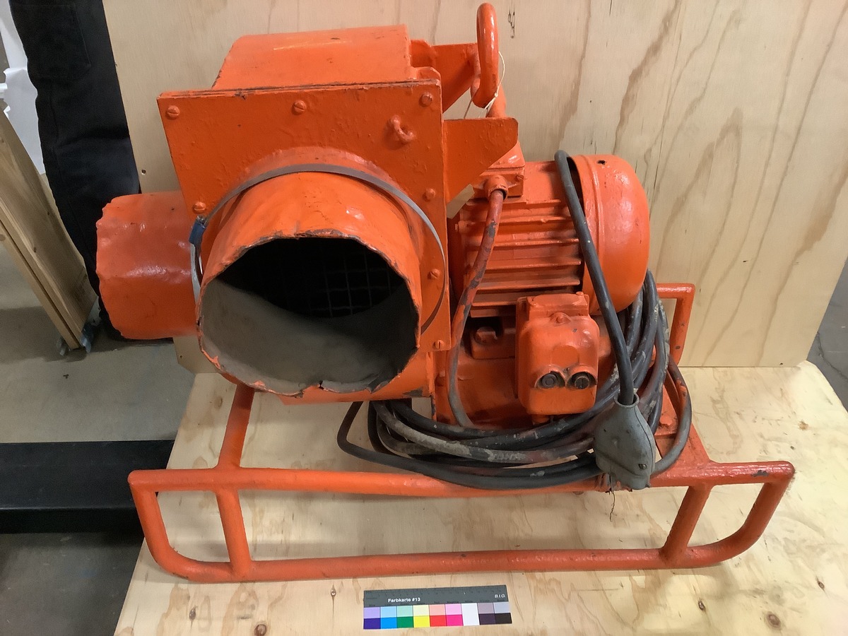 Eldriven centrifugalfläkt. Står på en rörställning. Fast elkabel med fyrpolig handske. Lyftögla. För ventilation vid svetsning, målning m.m. framför allt utanför verkstäderna.