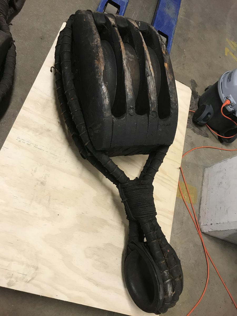 Block: 3-skivigt, gjutjärnsskivor, klädd tågstropp med fastbändslad kaus.