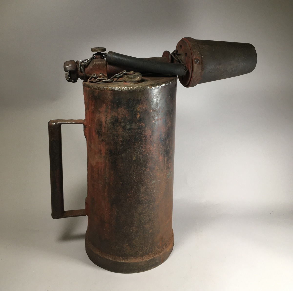 Blåslampa: Tryckluftsdriven. Cylinderformad behållare med handtag, på toppen munstycke för tryckluftslang och konformat, horisontellt riktat brännrör som går att skruva av. Bärhandtag i form av gummiklädd kedja.