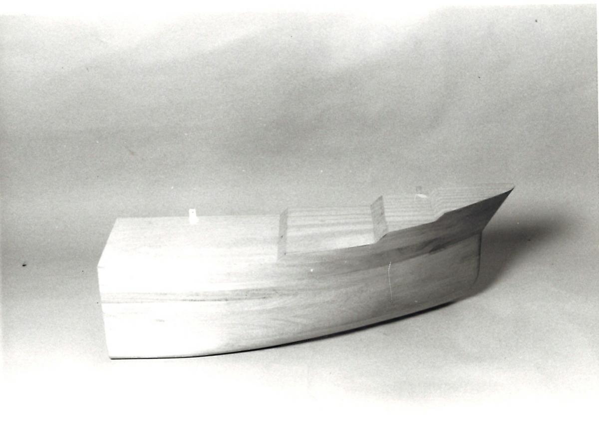 Inplanering & storleksbestämning av bordläggningsplåt samt utslag för olikformade bordläggningsplåtar. Förskepp: Utan plåtmarkeringar. Har uppbyggd back. Metallfästen.