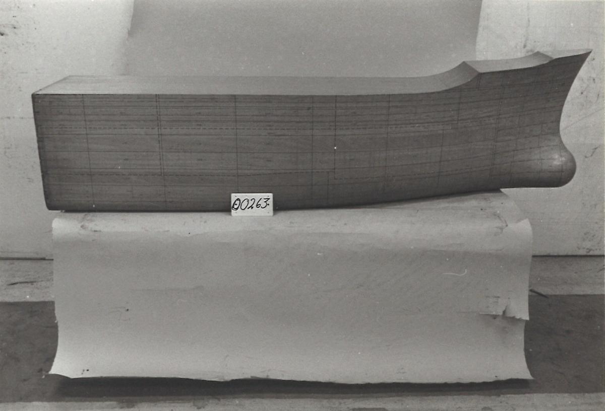 Inplanering & storleksbestämning av bordläggningsplåt samt utslag för olikformade bordläggningsplåtar. Förskepp: Med plåt- och spantmarkeringar i svart tusch och blyerts. Har bulb och uppbyggd back.