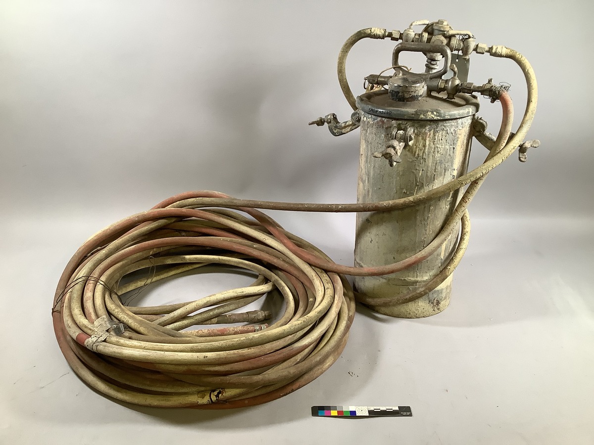 Cylindrisk behållare för färg med lock som hålls på plats av fyra vingmuttrar. På locket sitter en manometer med två skalor; graderade från 0-10 kp/cm² och 0-140 kp/cm² samt urtag för fyra slangar och ett bärhandtag. Tre slangar är kopplade till tryckfatet. Har använts i Dockan.