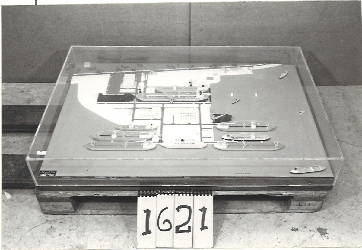 Varvsmodell av Lisnave varvet i plexiglasmonter. Varvsområdet i vitt och grått, havet blått. /LISNAVE/ står med blå text på taket till en av byggnaderna. 9 fartyg och 2 skrovsektioner ligger i docka eller vid kaj. 3 fartyg ligger ute på vattnet.