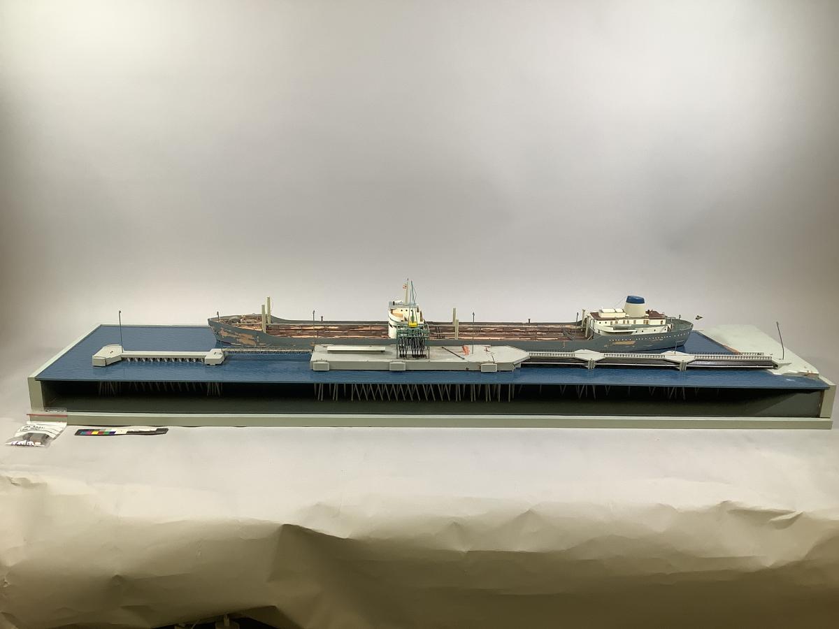 Modell: Schematisk, visar kajplats 510-511, Skarvikshamnen, Göteborg med lyktor och kran. Ett svenskt tankfartyg ligger vid kajen och lossar eller lastar olja. Hon för svensk flagg och amerikansk gästflagg. Längs kajens andra sida visas även pålveket under vattnet. Vit- och gråmålad.