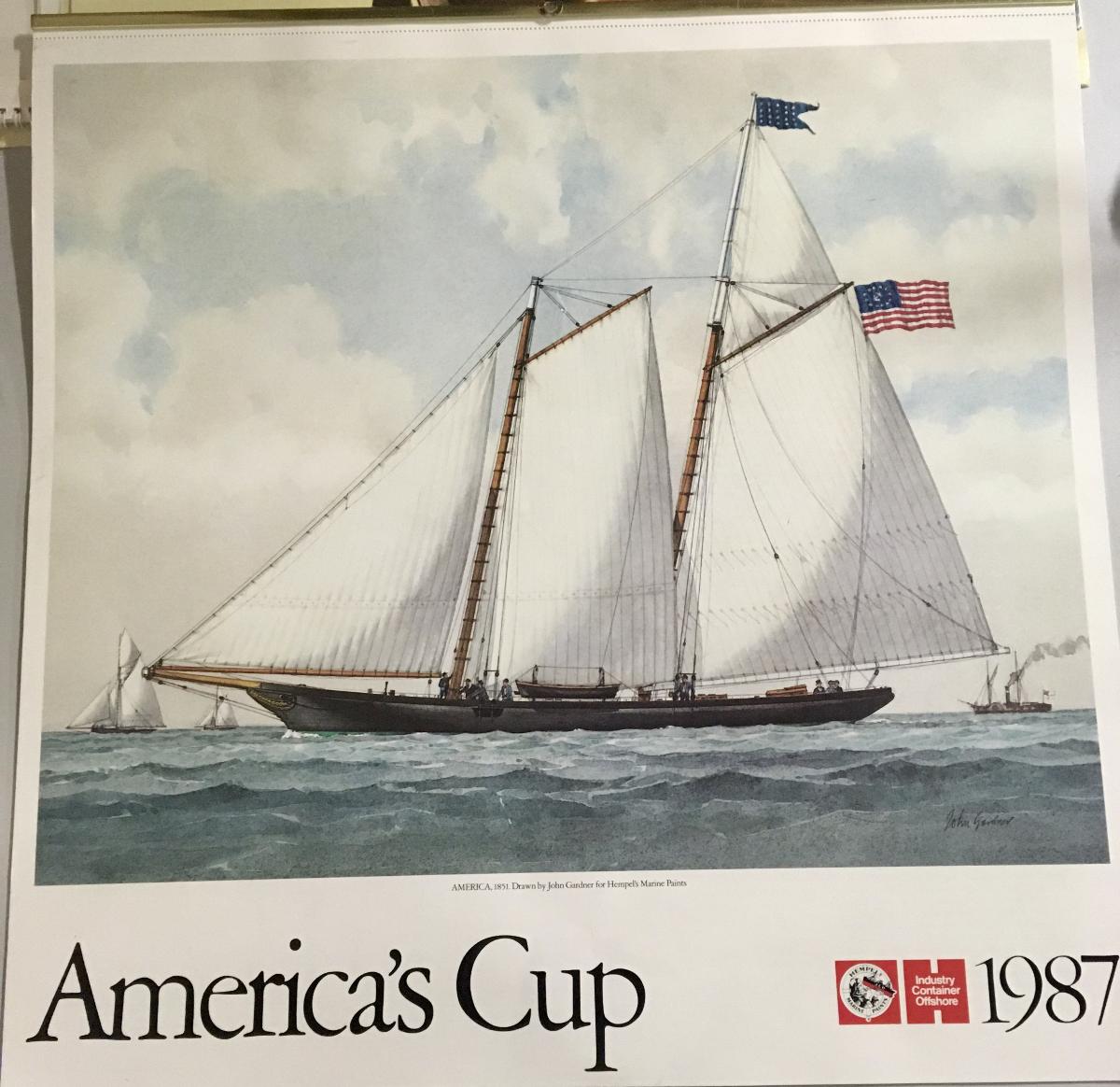 Almanacka: Bilderna i färg visar segelbåtar som deltagjt i America´s Cup: AMERICA 1851, MISCHIEF 1881, VIGILANT 1893, RANGER 1937, CONSTELLATION 1964, COURAGEDUS 1974, AUSTALIA II 1983.
