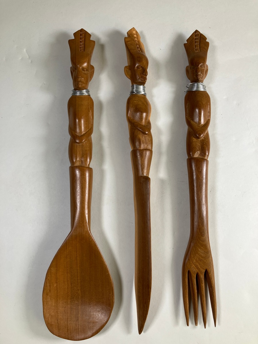 Souvenir a= Gaffel: skaftet är utformat som en knäböjande människa med händerna knäppta fram. Huvudet har stora utstående öron och en hög panna som övergår i någon slags spetsig huvudbonad. Runt halsen sitter ståltråd virad i flera varv som ett halsband. b= Kniv: se a. c= Sked: se a.