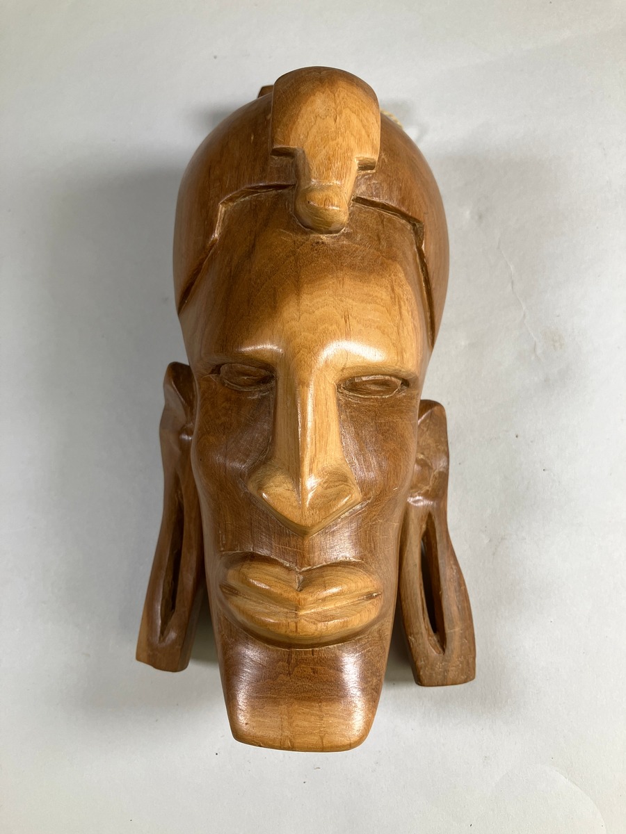Souvenir på Broströms fartyg. Snidat huvud med tjocka läppar, kraftig näsa och höga kindknotor. Örsnibbarna är utdragna med ett långt hål igenom. På huvudet sitter ev. en hjälm (kort frisyr?) med något slags märke mitt fram. Baksidan platt. En ögla att hänga upp huvudet i är utskuren ur samma trästycke längst upp.