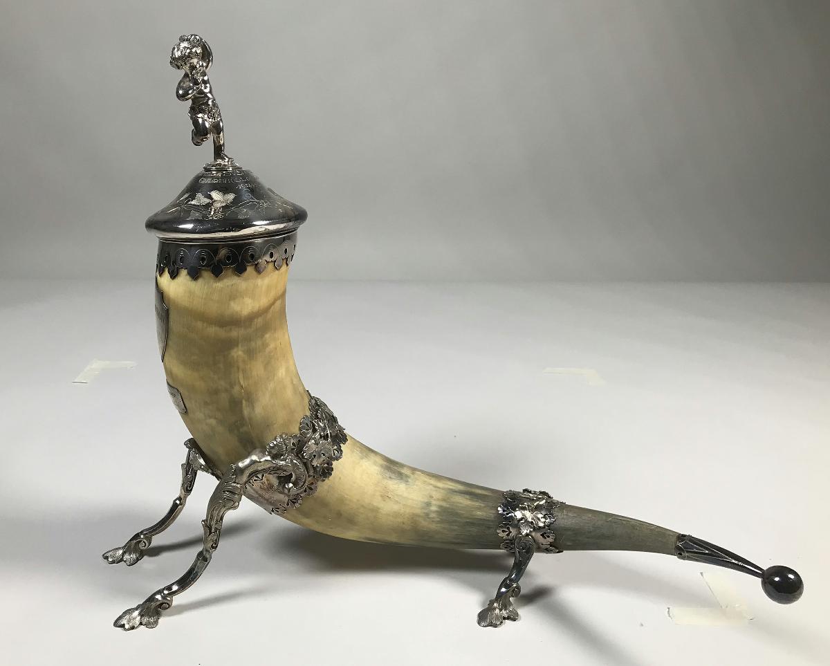 Utsmyckning på varvskontoret, Lindholmens varv. Har tillhört följande varvschefer 1) Norrman, Carl Elis, 1854-1879, gåva av 3 anställda efter 25 års tjänst. 2) Telander, Emil 1891, gåva av Carl E. Norrmans barn. 3) Almqvist, Agnes och Sven, 19280928, gåva på guldbröllopsdagen. 4) Telander, Gunnar, 1931. 5) Löwenhielm, Gustav, 1954. 6) Carlsson, Carl Eric, 1968. Stånka: Svängt horn stående på 4 ben. 2 gördlar går runt hornet i dessa är benen fästade. Gördlarna är försedda med en vinlövsranka, benen är ornamenterade med bladrankor och halva kvinnokroppar på de främre, längre benen. Mitt fram, mellan benen och upp mot kanten på hornet sitter först ett manshuvud med skägg och så 2 graverade plaketter. Kanten är klädd med en flikig bård. På hornets spets sitter en kula. Locket är graverat med bladrankor och på dess topp står en dansande liten polke med vinlövskrans kring magen och huvudet.