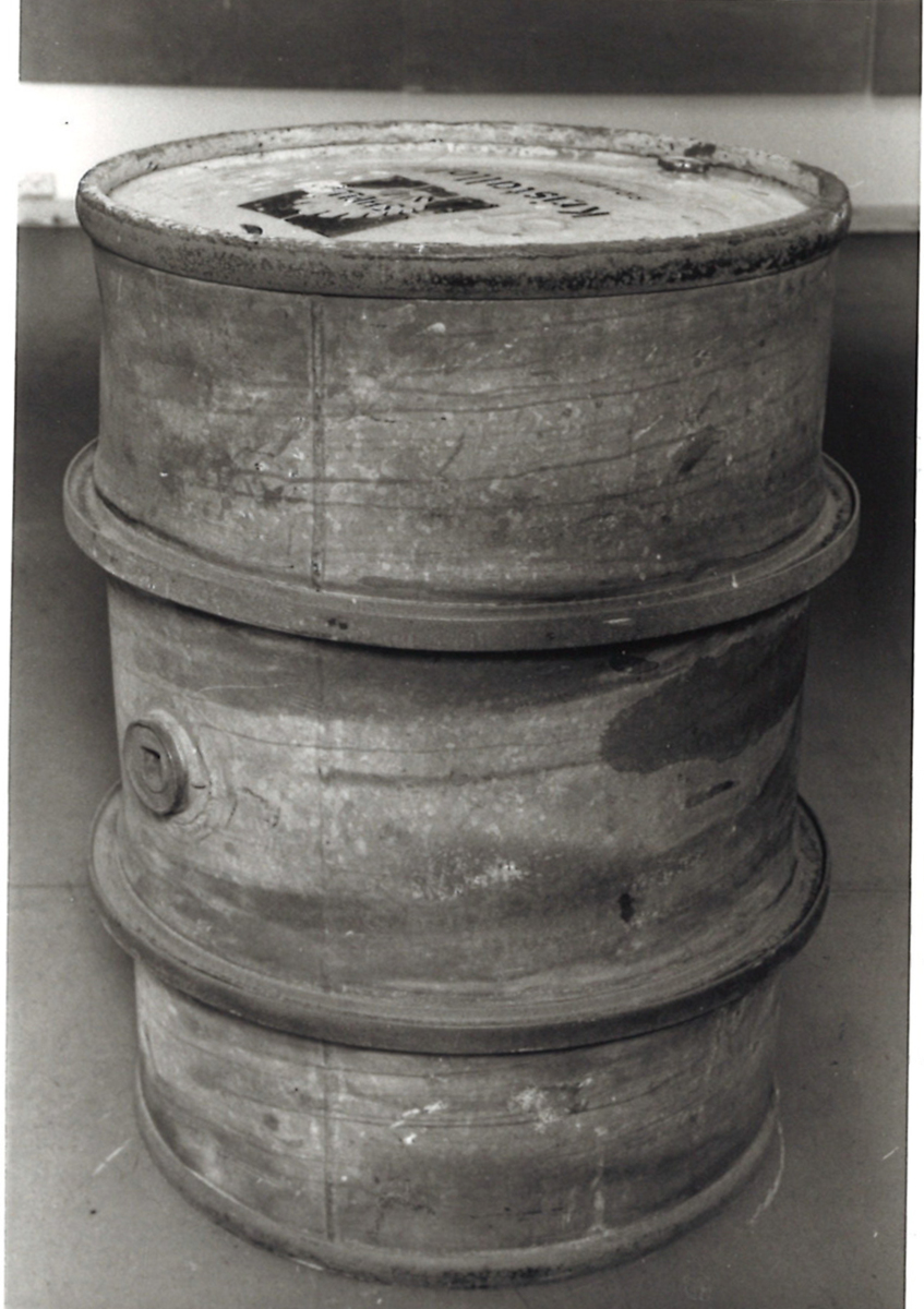 Oljefat, rakt, målat med gul färg på kortsidorna, med band vid kortsidorna samt med två rullband. Med större skruvlock på långsidan och mindre på ena kortsidan. Transportera olje- eller bensinprodukter.